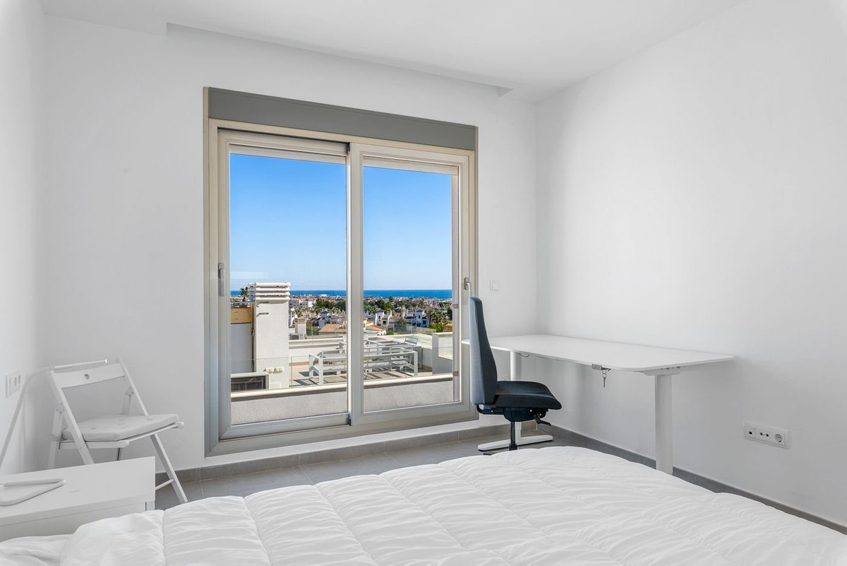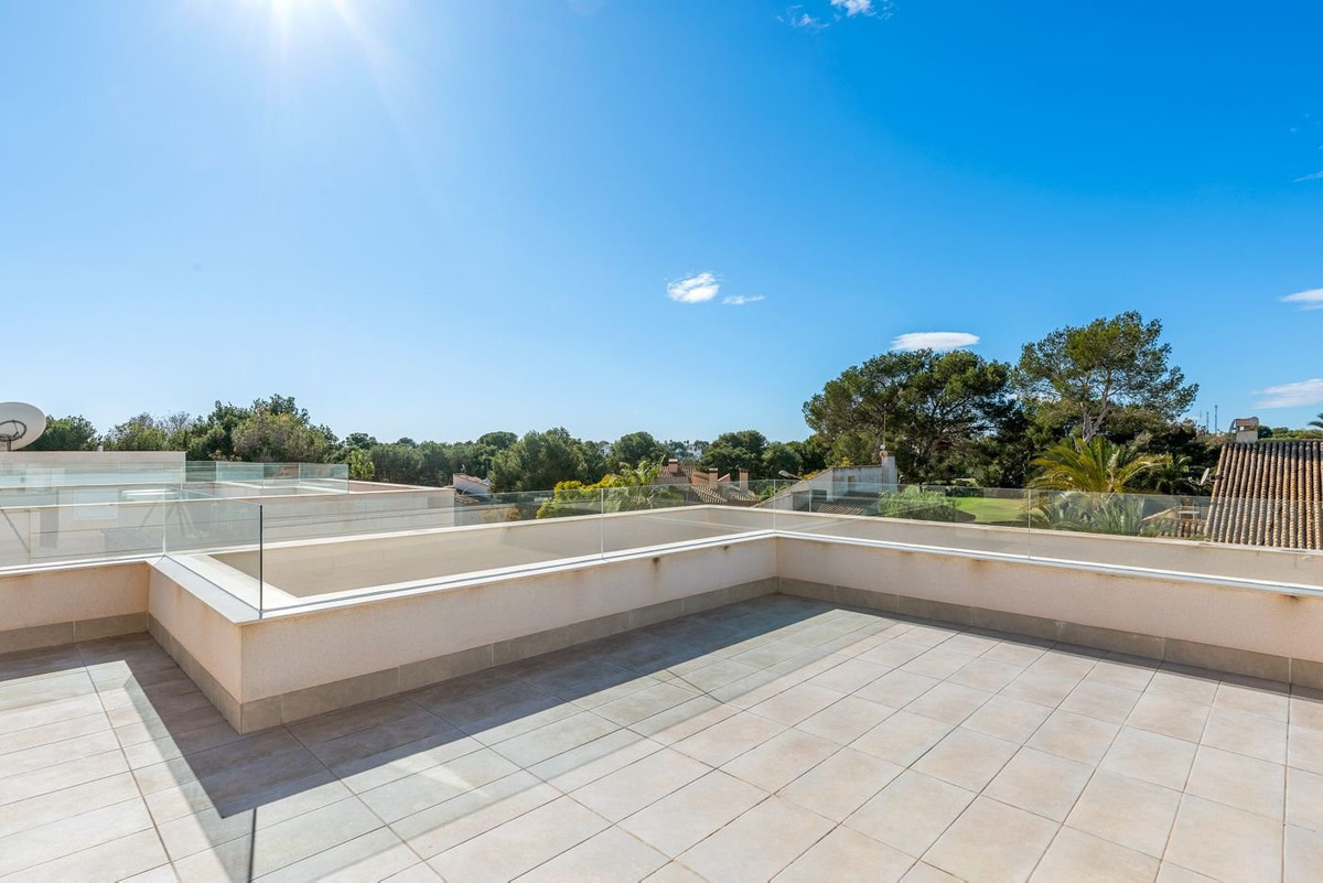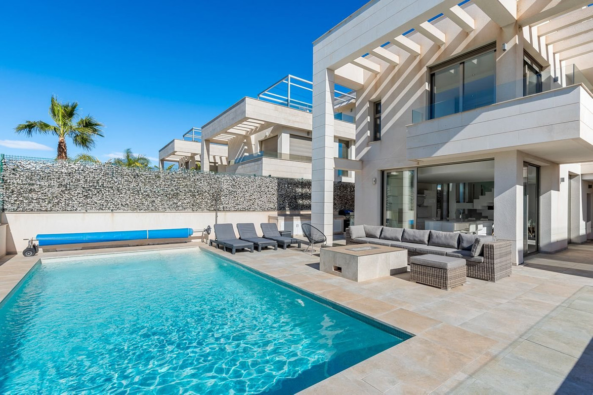 This impressive villa from 2018 is created in an elegant and modern style with plenty of space and functional solutions.With a total of 197 m² spread over three – actually 4 floors, you get a home that combines style, comfort and flexibility – perfect both as a year-round home and as a luxurious holiday home.Interior and floor planThe villa offers 6 bedrooms (one is used as an office today) and 3 bathrooms, distributed over the different levels, which provides optimal settings for both family life and guests.On the ground floor you will find a large, open kitchen with a kitchen island and a good dining area, and the large windows ensure a beautiful influx of light.In addition, there is a separate TV room that creates a cozy atmosphere. A guest toilet completes the floor.On the first floor is the master bedroom with its own access to a nice balcony and also with its own bathroom (ensuite), as well as two more spacious bedrooms and an additional bathroom.From this floor there is access to a large roof terrace with a summer kitchen and a large spa bath, where you can enjoy the warm evenings and the fantastic view.The villa also has a full basement, which provides plenty of extra space. Here you will find:- A large garage with space for several cars and storage- 2 additional bedrooms- 1 office/bedroom- 1 bathroom- Extra storage room- The driveway to the garage/basement is made with a cover like a carportFantastic outdoor areas and luxury facilitiesThe outdoor areas of the home are designed to enjoy the Spanish climate.Here you will have your own private swimming pool, where you can cool off on hot summer days. The swimming pool also has heating, so you can also enjoy a good temperature in the pool in winter. In the garden area you also find a summer kitchen with a barbecue.On the roof terrace you will also find a spa, perfect for relaxation with views of the golf course, the city lights and all the way to the sea.There is also an outdoor shower to cool off when sunbathing.The home is equipped with air conditioning that can both heat and cool, so you are guaranteed a comfortable temperature all year round, as well as underfloor heating in the bathrooms for extra comfort. In addition, there is an alarm system and fiber internet, so both security and modern technology are in place.Perfect location – close to everythingThe villa has an attractive location in Villamartin, an area known for its beautiful golf courses and proximity to the coast. Here you live close to everything you need:Villamartin Golf Course – one of the areaapos;s most popular golf coursesVillamartin Plaza – with restaurants, bars and a supermarket within walking distanceZenia Boulevard – one of Spainapos;s largest shopping centers (2.8 km, approximately 10 minutes by bike)Playa de la Zenia – one of the best beaches in the area (8 minutes by car)Alicante Airport – 40-50 minutes drive depending on route choiceA unique opportunity to own a spacious and modern villa in an attractive area.Contact us today to book a viewing.~