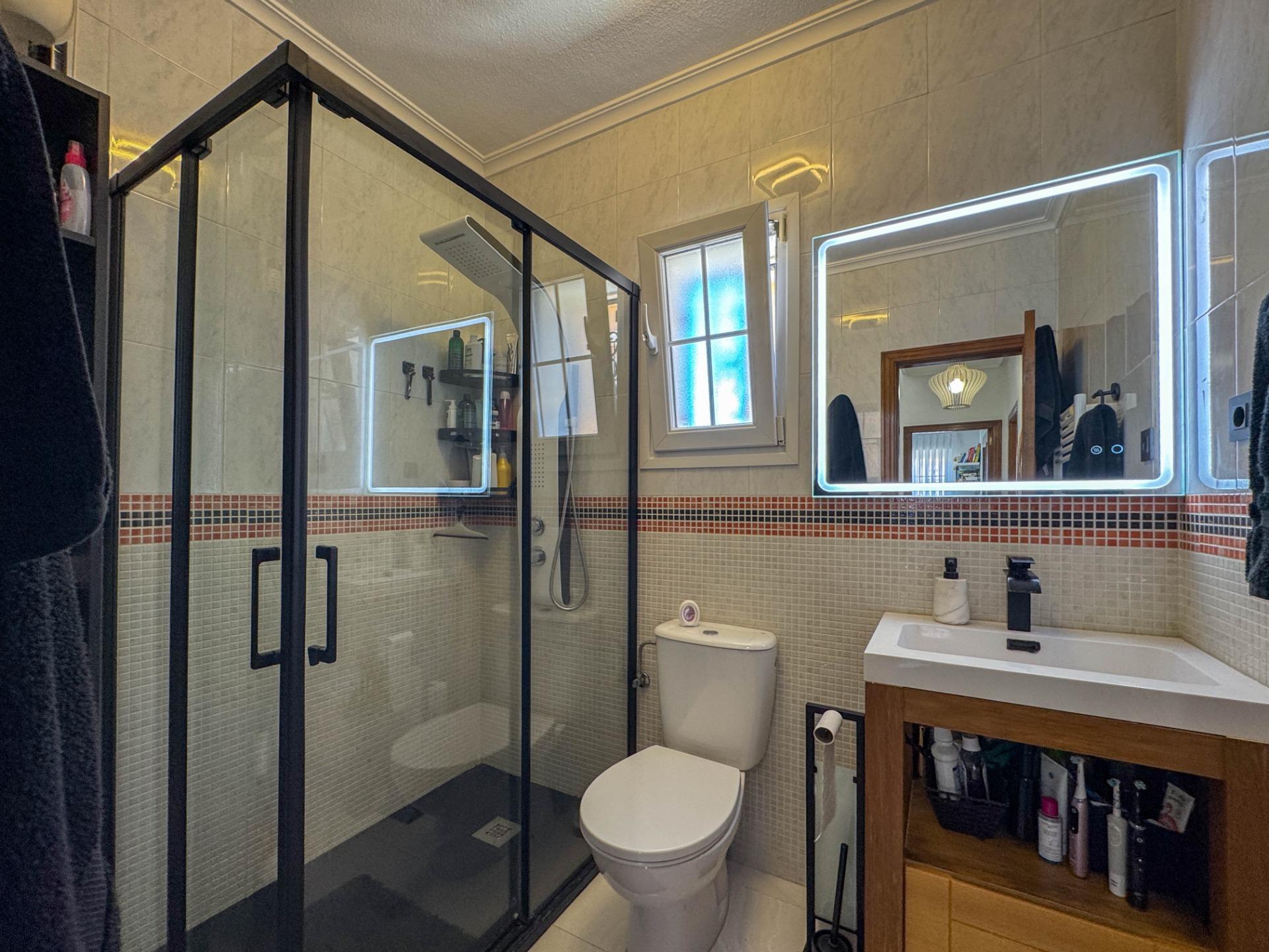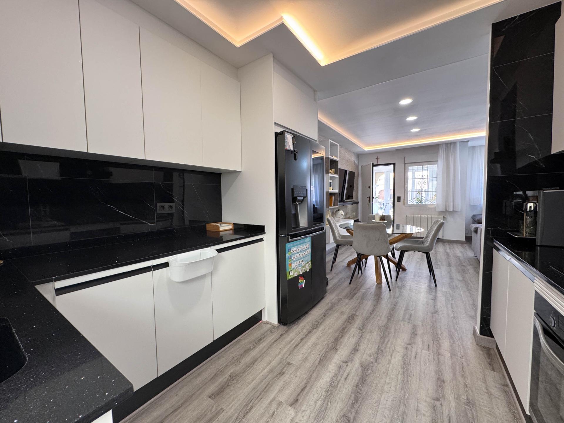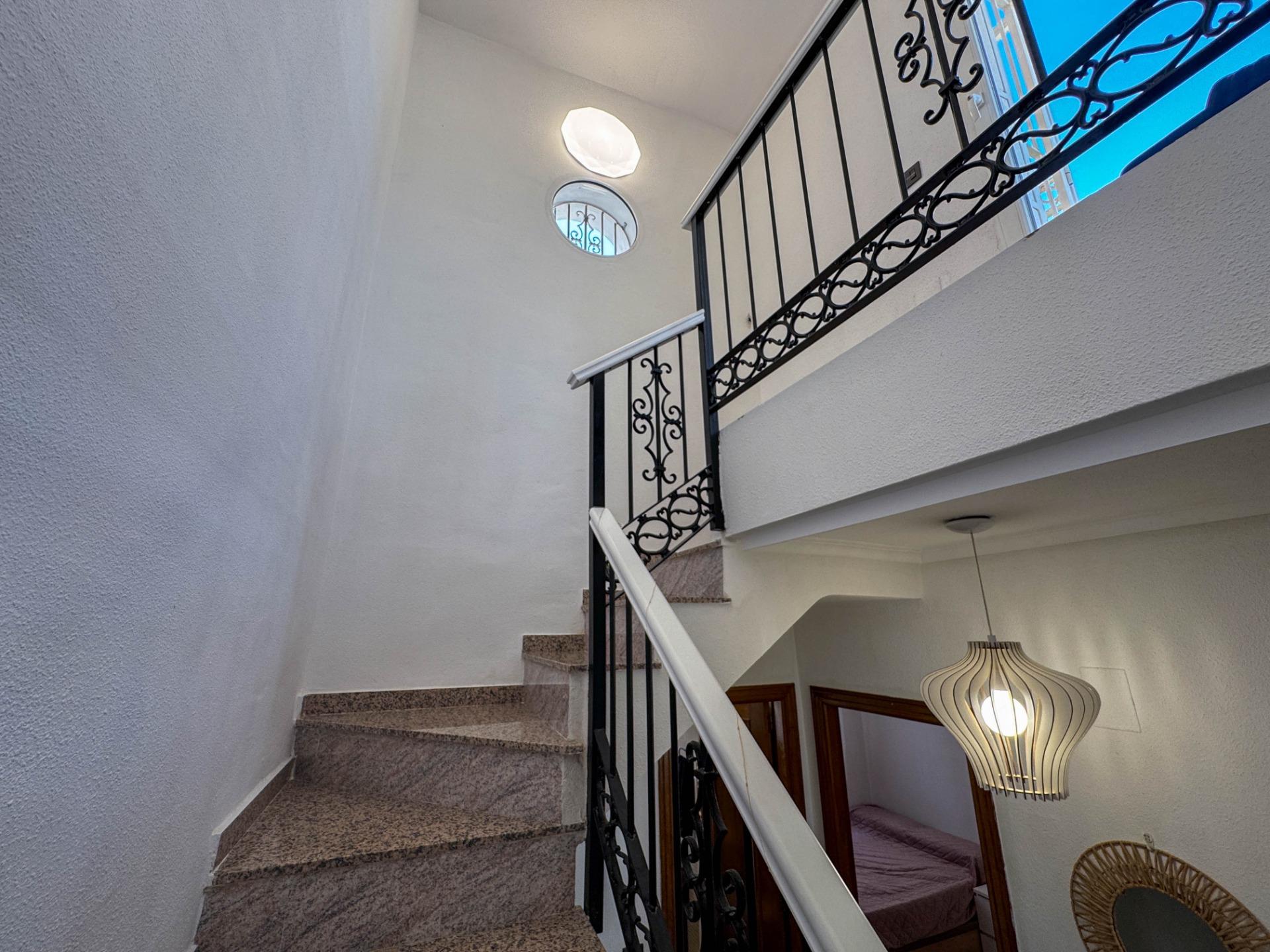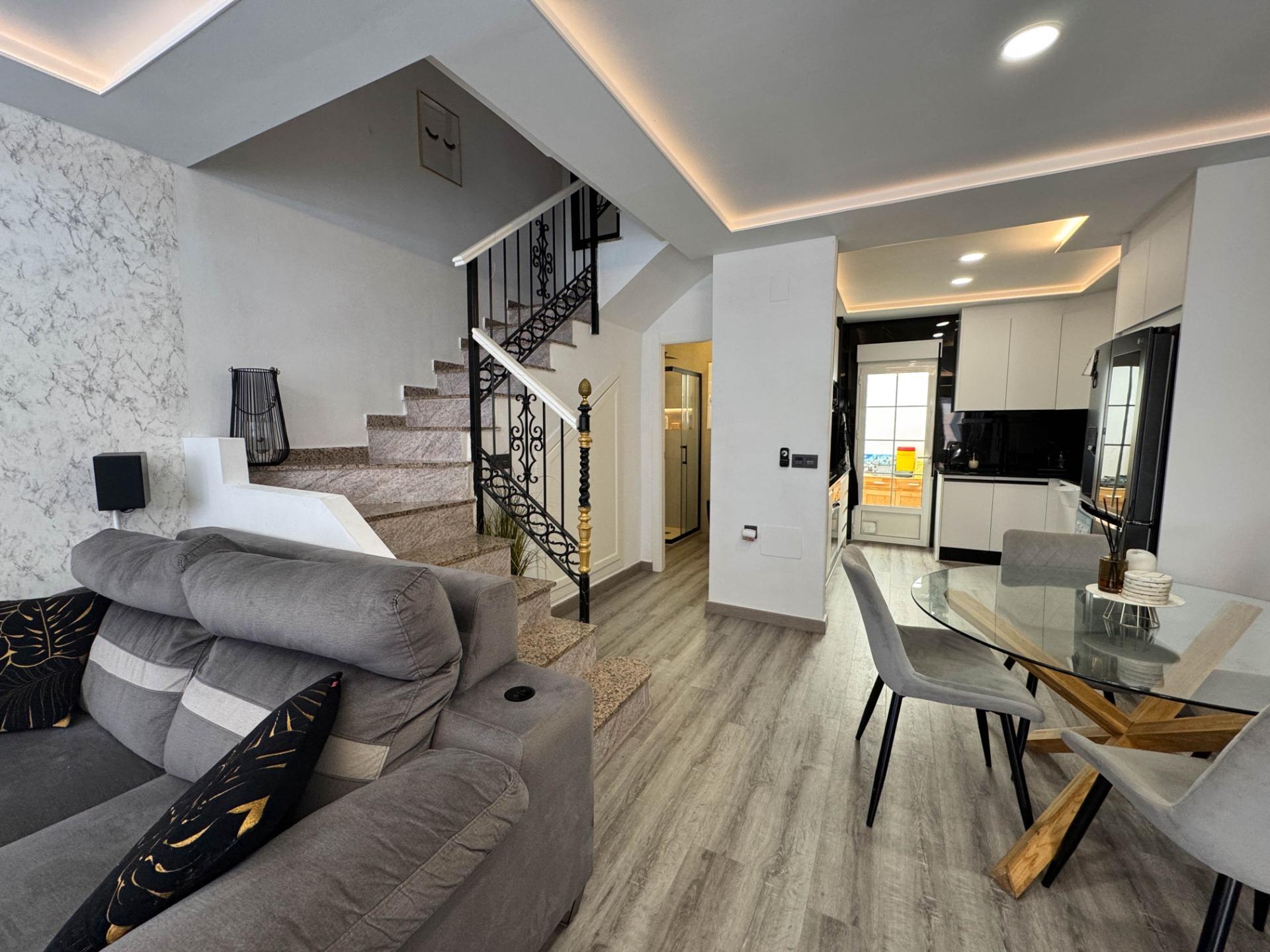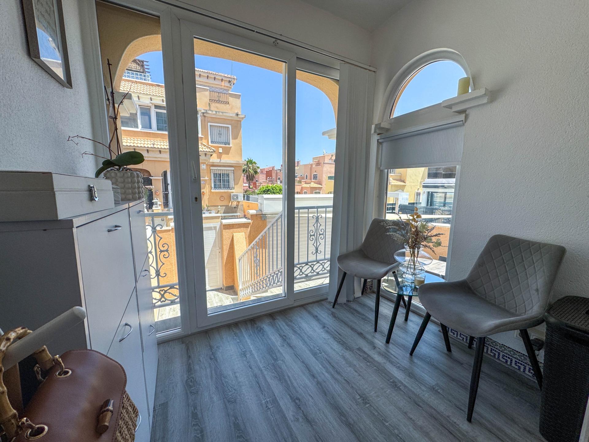 Ten w pełni odnowiony dom w zabudowie bliźniaczej znajduje się w spokojnej dzielnicy PAU 26 w Orihuela Costa i oferuje wysoki komfort oraz nowoczesne wnętrze. Nieruchomość została niedawno wyposażona w wysokiej jakości meble i sprzęty i jest gotowa do zamieszkania – idealna na pobyt całoroczny lub dłuższe wakacje.~~Dom składa się z dwóch kondygnacji i obejmuje dwa pokoje dwuosobowe oraz jeden jednoosobowy, a także dwie kompletne łazienki – na parterze i piętrze. Jasne wnętrze zawiera nowoczesną, w pełni wyposażoną kuchnię, przestronny salon i bezpośrednie wyjście na prywatne solarium z jacuzzi. Na piętrze znajduje się także balkon, a z boku domu strefa grillowa.~~Informacje kluczowe:~~Lokalizacja: PAU 26, Orihuela Costa~~Układ: 2 sypialnie dwuosobowe, 1 sypialnia jednoosobowa, 2 łazienki (na dole i na górze)~~Dodatki: Duże solarium z jacuzzi, nowoczesne meble (w większości w cenie), wysoki mur zapewniający prywatność~~Komfort: Klimatyzacja w całym domu, ogrzewanie gazowe, system filtracji wody (pitna woda z kranu)~~Na zewnątrz: Balkon, solarium, grill, pomieszczenie gospodarcze/pralnia~~Parking: Dwa miejsca (jedno na posesji pod zadaszeniem, drugie zarezerwowane przy ulicy)~~Bezpieczeństwo: Cyfrowy wizjer z aplikacją mobilną~~Informacje o osiedlu:~~Cicha i zadbana urbanizacja~~Basen wspólny~~Podatek IBI: 275 € rocznie~~Opłata wspólnotowa: 350 € rocznie~~Świetna okazja do zamieszkania lub inwestycji w jednej z najbardziej cenionych dzielnic Orihuela Costa.~~Skontaktuj się z nami w celu uzyskania dalszych informacji lub umówienia wizyty.~~~