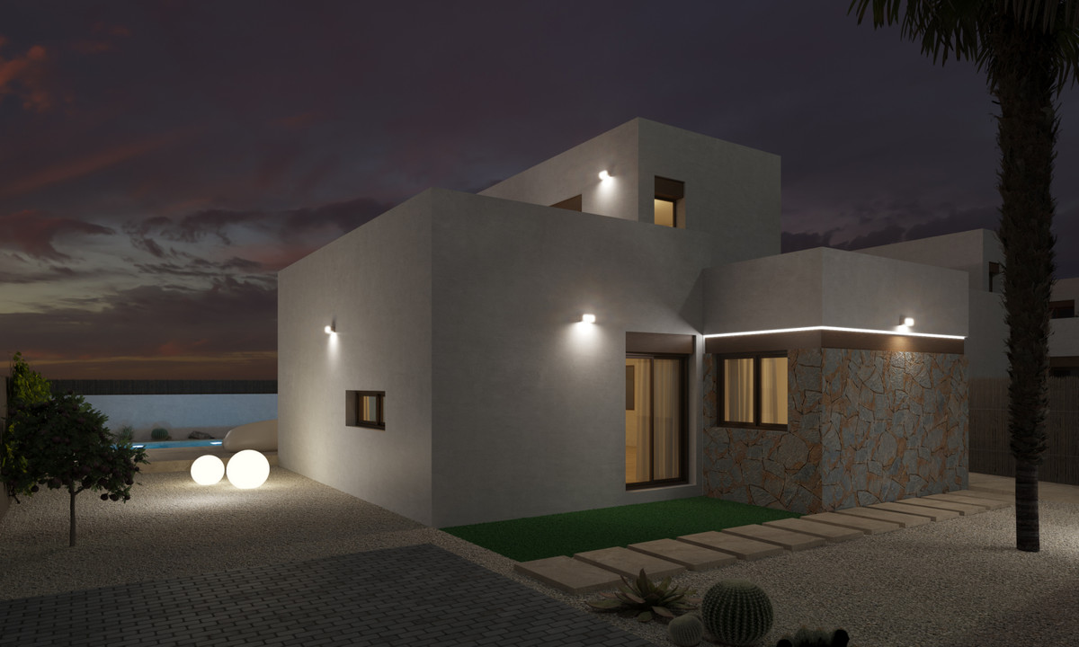 New Development: Prices from 469,000 ? to 595,000 ?. [Beds: 3 – 3] [Baths: 2 – 2] [Built size: 113.00 m2 – 131.00 m2]These Villas are located in Algorfa in the surroundings of one of the most exclusive 5-star Resorts with a golf course in Spain in the extreme south of Alicante Province.Its privileged location near La Finca Golf amp; Spa Resort allows enjoyment of all the services the complex offers.Additionally, it is close to the most beautiful beaches of the southern Costa Blanca and to places of exceptional beauty such as the Torrevieja Pink Salt Lakes and the Dunes of Guardamar del Segura.Its proximity and easy access to the AP-7 motorway and main national roads connect these villas with numerous towns on the Costa Blanca, including Orihuela, Cartagena, Elche, Murcia and Alicante.The airports of Alicante and Murcia are less than 40 km away, offering connections to the main European capitals. Alicante, the provincial capital, is less than an hour away by car.The new project comprises 6 villas, each with 3 bedrooms and 2 bathrooms on two levels, including a fully equipped kitchen and a private swimming pool. Features such as private indoor parking, electric shutters, ducted Air-conditioning, a management domotic system and a fully fitted alarm system are some of the main specifications of this exclusive development.Sun all the day long.The open concept properties with windows and sliding doors that allows cross ventilation and lets the light in. The properties are situated so, that the light can enter everywhere, but at the same time it offers some fresh and cozy corners.DesignExclusivity with Contemporary DesignThese villas connect us with the ancient Mediterranean cultures and building tradition combined with the modern architecture to create charming homes, reflecting our commitment and effort to offer you the best in space and design trends.The design combines modern lines with traditional elements such as stone on the facade and wood, adding the warmth of traditional construction. The layout of the homes maximizes the use of natural sunlight throughout the day and enhances privacy and cross ventilation.~