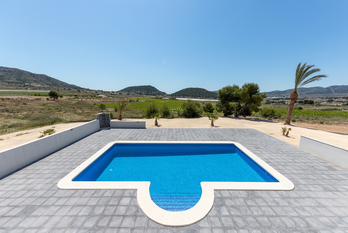 Magnificent newly built villa for an exceptional price! This fantastic villa is located in the Novelda area. The main house and other buildings add up to a total of 180 square meters built, located on a 10,000 m2 plot, of which approximately 3,500 m2 are fully fenced. You have the option of choosing the finished basement or a separate guest house. The price includes the 4 x 8 m2 pool and kitchen furniture of your choice of excellent quality. The main house consists of a large bright living room, a good size kitchen distributed as you wish, 3 bedrooms and 2 bathrooms. Also in the basement or guest house you will have 2 more bedrooms and 1 bathroom. The house has Air Conditioning.You will be the one who chooses aspects such as: kitchen furniture, tiles, flooring, doors, color of the windows, color of the façade, stone of the façade … make your magnificent chalet your unique home!We are specialists in the Costa Blanca and Costa Calida specialising in the Alicante and Murcia Inland regions with a particular emphasis on Elda, Pinoso, Aspe, Elche and surrounding areas. We are an established, well known and trusted company that has built a solid reputation amongst buyers and sellers since we began trading in 2004. We offer a complete service with no hidden charges or surprises, starting with sourcing the property, right through to completion, and an unrivalled after sales service which includes property management, building services, and general help and advice to make your new house a home. With a portfolio of well over 1400 properties for sale, we are confident that we can help, so just let us know your preferred property, budget and location, and we will do the rest.~