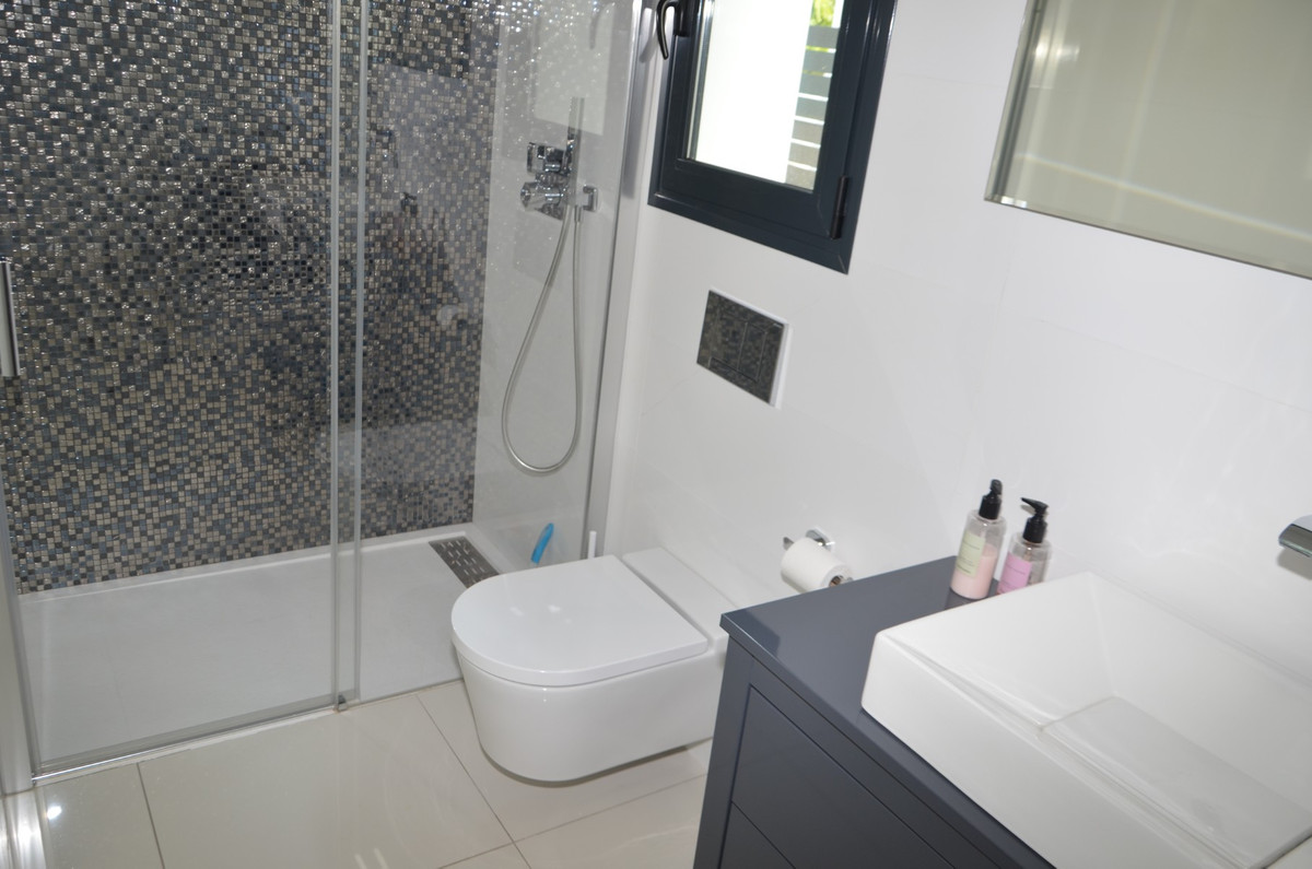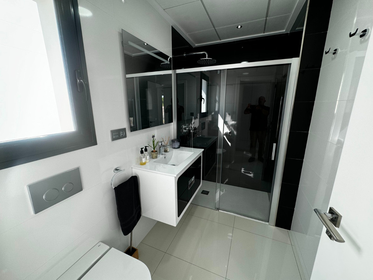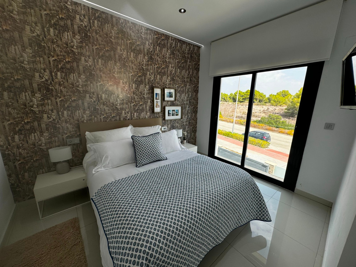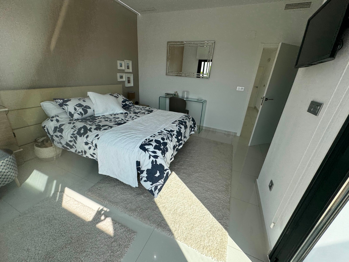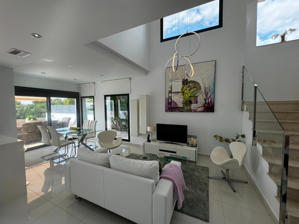 A luxurius villa with beautiful views across the orange fields and views towards the sea. This modern villa is very spacious and has three bedrooms with three bathrooms, a large private pool and is very private. The property is located on the Lo Romero Golf course and has 360 degree views of the sea, golf, mountains and the various orchards. The villa has air conditioning with airzone, underfloor heating in the bathrooms and electric shutters, with the high ceilings and the South facing orientation this is a very light and airy villa and is perfect for anyone looking for views and peace and quiet.~