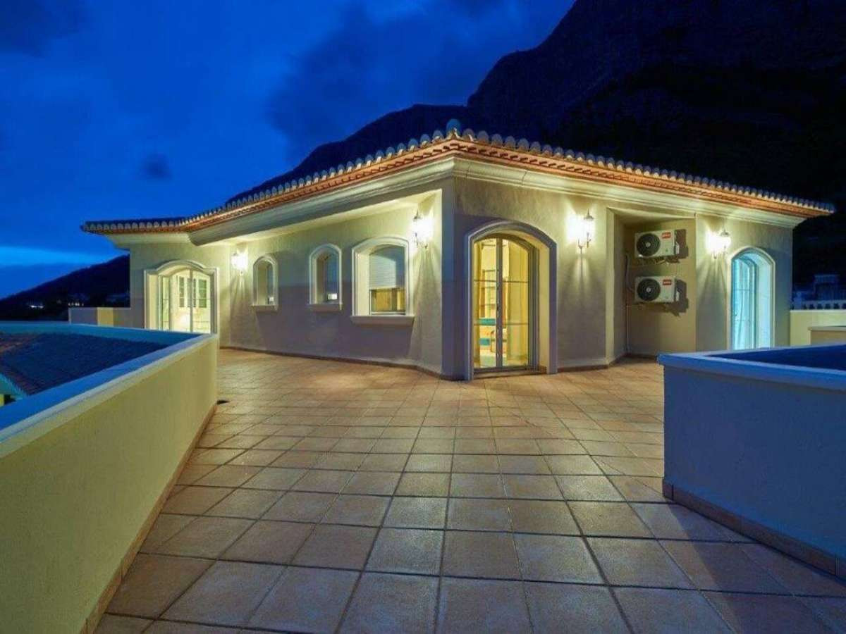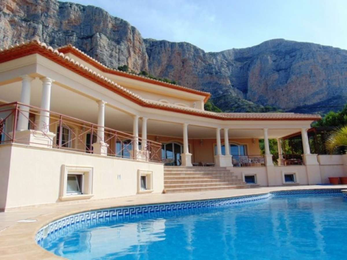 Impressive designed property on the upper slopes of the Montgo with fantastic South facing views.Located 15 minutes from the Old Town of Javea, 10 minutes from La Sella Golf and 15 minutes from the town of Denia.Automatic gates down a gently sloping driveway with plenty of parking, double garage and space for boats or caravans.Porch leading through to an impressive hallway with fabulous wrought iron staircase, leading to upper bedrooms.On the main level at the entrance is a large office/Study/Library, Guest WC, 42m2 Lounge with Feature fireplace and doors leading out onto a wide Naya area overlooking the Swimming Pool, ideal for watching the sunsets.Adjacent is a second lounge ideal TV room or games room. Large Dining room suitable for seating 12 people again with doors leading out onto the terrace.Stylish Kitchen with dining area, featuring central reservation with halogen hob, double oven and Microwave, and separate utility with drying area.Spacious guest bedroom with dressing area and en-suite bathroom with double vanity units.On the upper level are three equally spacious bedrooms all with en-suite bathrooms and with access to a large terrace to enjoy the morning sunrise. The main bedroom has air conditioning and a jacuzzi bath.The 12×6 freeform pool with jacuzzi, pretty terraces and established trees the area and below is a tennis court.On the lower level of the villa accessed internally is a variety of rooms ideal as a gymnasium, apartment, kitchen with plumbing ready. All prepared and ready to go.~