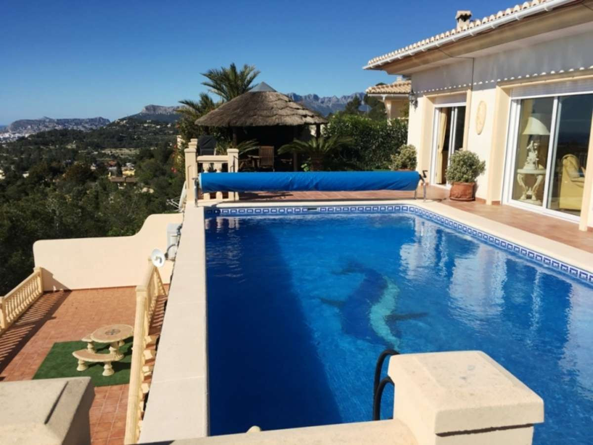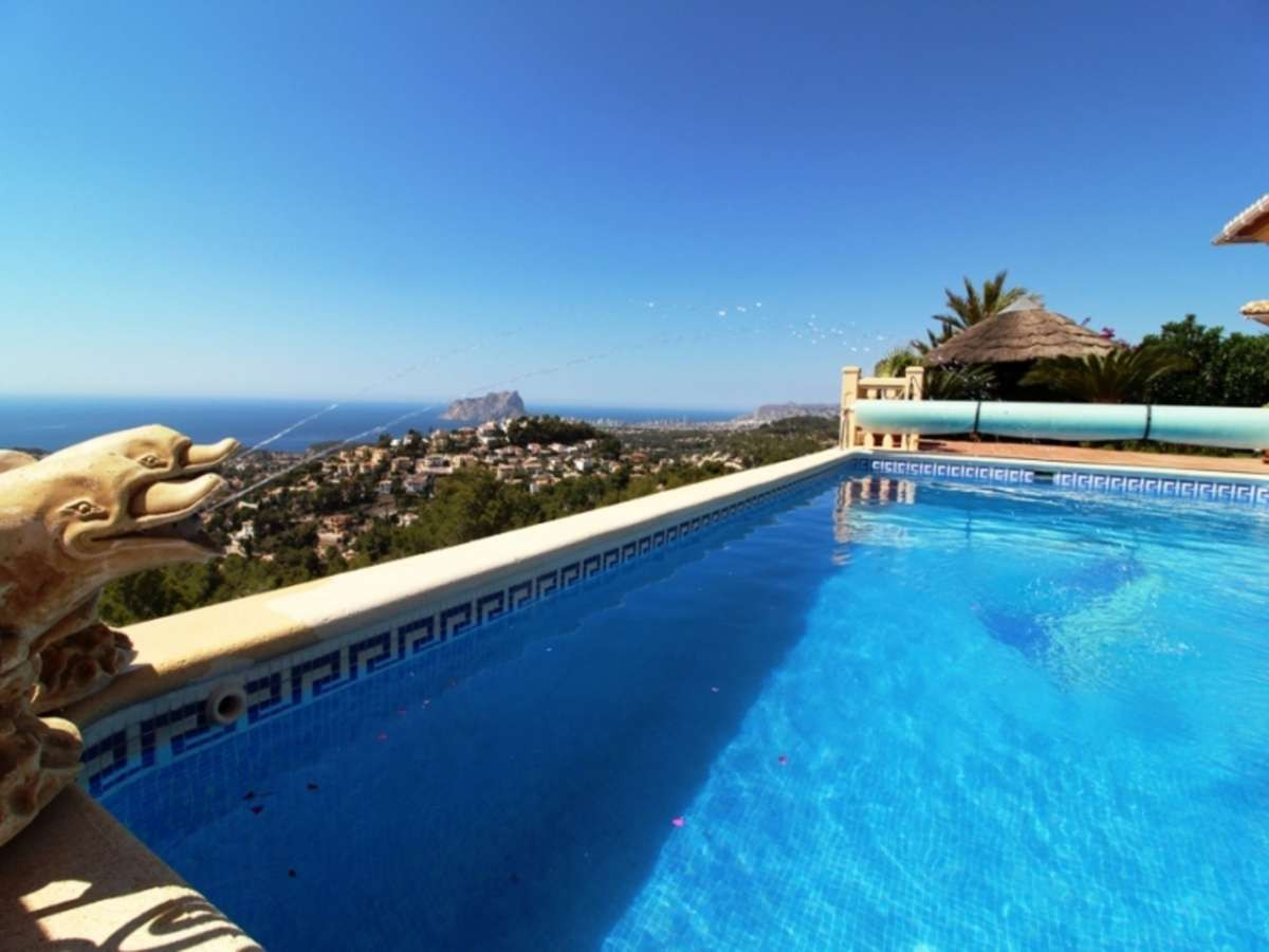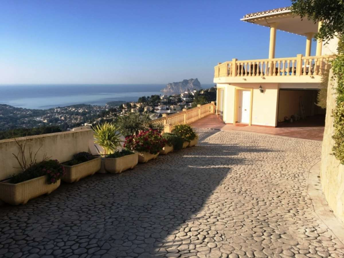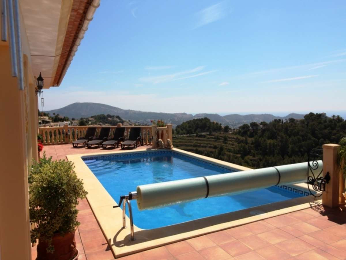 Panoramic Villa with stunning sea views for sale in Benimeit, 4.5km drive to the town of Teulada and 5km to the Blue flag sandy beaches of Moraira.Built-in 2004 comprises of one main level with spectacular views of the sea and Penon de Ifach. Entry via a driveway leading to the double garage. On the upper lane a Pedestrian gate to the main door or via the internal staircase from the garage. Entry via the main door into the spacious open plan Lounge and Dining area, with large sliding doors with views over the pool to the sea.Open plan kitchen with central Island and granite worktops, fully fitted with appliances, double oven and sliding doors to the pool terrace. Underfloor Central heating on this level together with Air conditioning in all bedrooms. The double glazing windows have electric blinds.Doors from the Kitchen and Lounge flow onto the newly laid terrace with non-slip natural stone tiles, designed to collect any surface water and diverts to a large water deposit and diverted and used in the garden via a timed irrigation system. Master bedroom with His amp; Hers fitted wardrobes in the walk-in closet area, sliding doors flowing out to the terrace. En-suite bathroom with corner bath and walk-in shower, double vanity unit, WC. Further two bedrooms with fitted wardrobes sharing a shower room.Internal staircase to lower level with an independent 1 bedroom, sea view guest apartment with en-suite shower room, full kitchen access from the garage or independent front door.Outside on the 785m2 plot, the terrace has an open Naya, 8 x 4m2 infinity swimming pool, Portable BBQ area and a shady Gazebo. Established and manageable garden with flower, Mediterranean plants and fruit trees. There is also a lower terrace leading from the guest apartment.Extras include a high-tech video surveillance system with cameras that can be accessed via your mobile device anywhere in the world. Wall mounted solar heating system for hot water and heating the pool, New water pressure of 4 ¼ bar, new costs effective heating system, cutting yearly flue bills. Wifi throughout the property.~