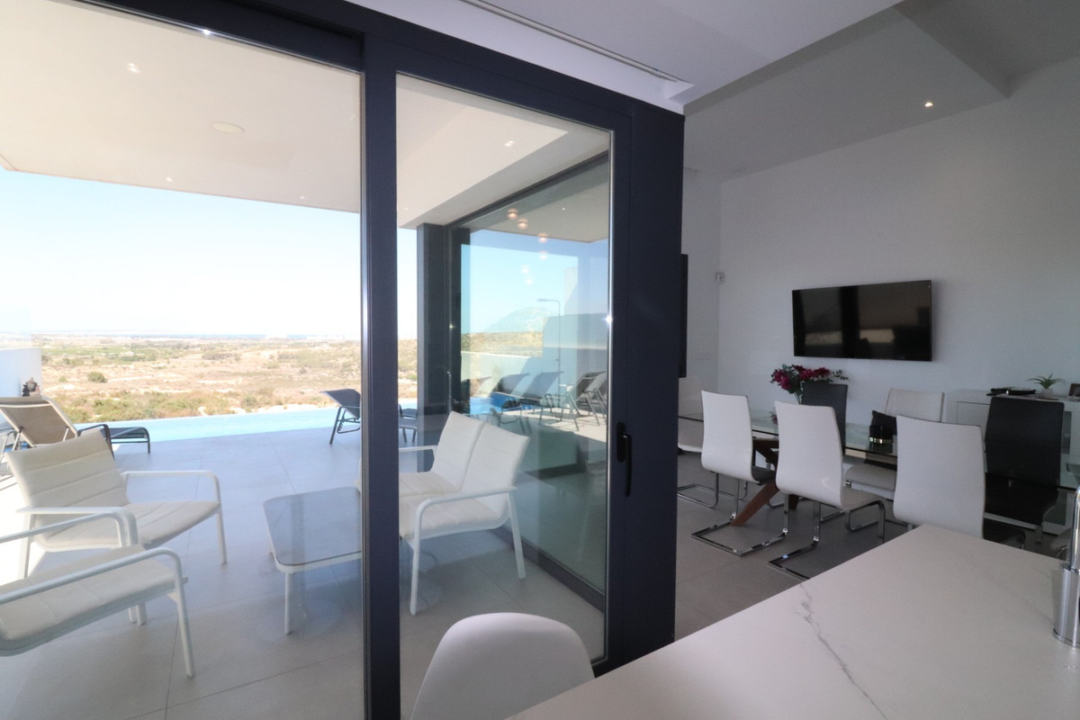 This As New, Modern, 2021 Built, East Facing, Three Bedroom Detached Villa in Ciudad Quesada is located in Pueblo Lucero, near to the Recorral, offering a luxurious lifestyle with breathtaking, panoramic, uninterrupted country and sea views from the terrace and pool area. Within a minuteapos;s drive from amenities and facilities, this villa boasts an infinity private pool and an air zone air conditioning system throughout. The open-plan kitchen leads to a separate utility room, while all three bedrooms are fitted with wardrobes and en suite bathrooms. The property also features 2 shower rooms, 1 bathroom, and 1 cloakroom, along with an internal courtyard and a private tiled garden. Additional highlights include a covered patio area, an underground garage, a BBQ area, a storeroom, and a spacious 2nd living room and entertainment area in the underbuild. The villa is equipped with an alarm system and is just a 10-minute drive from the beach.lt;br /~