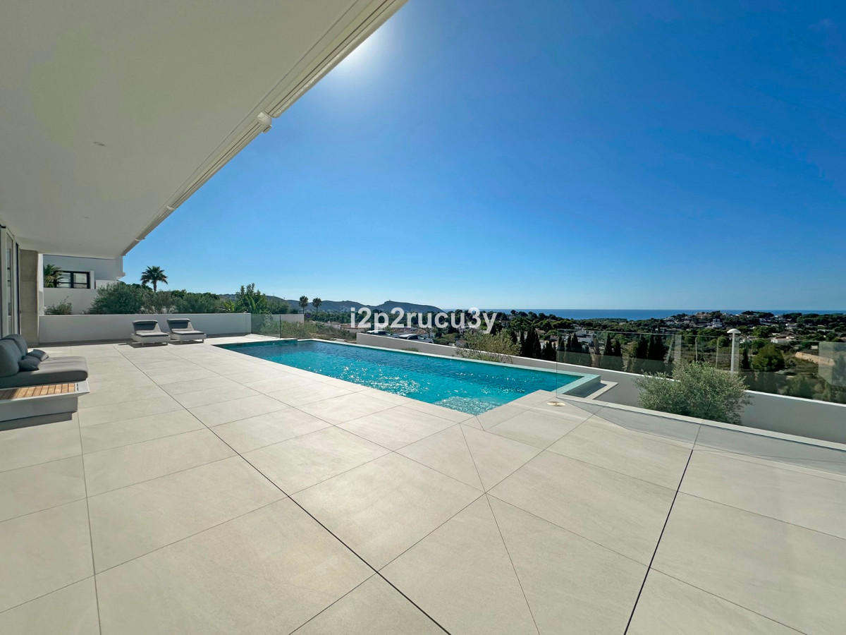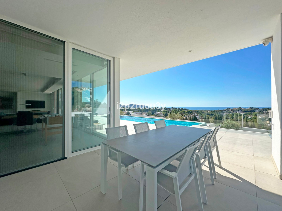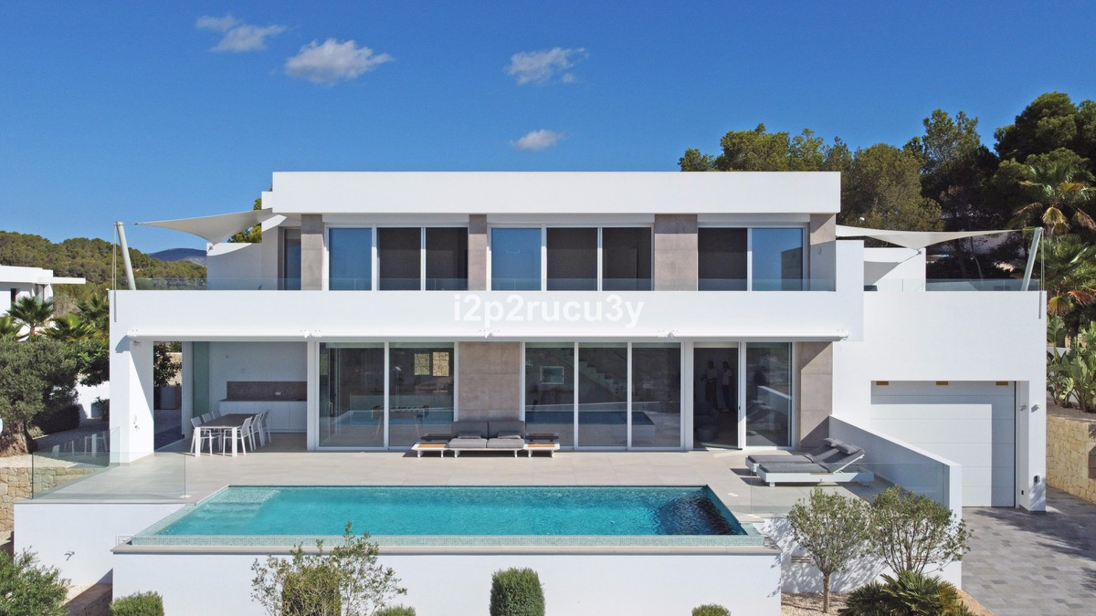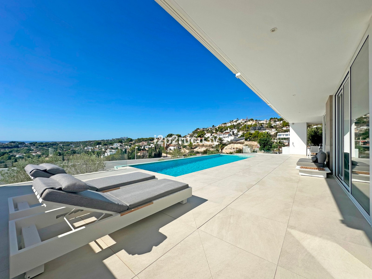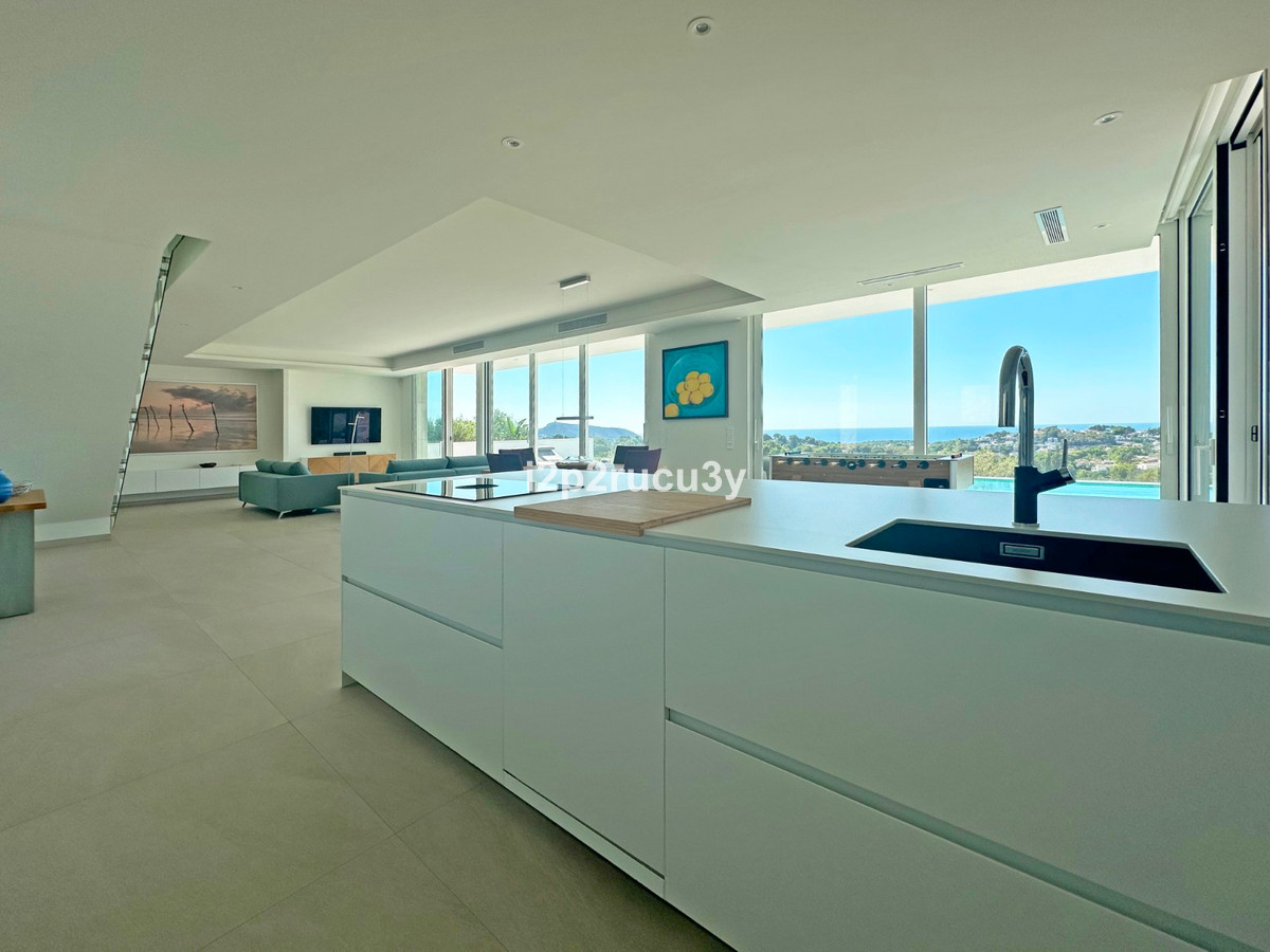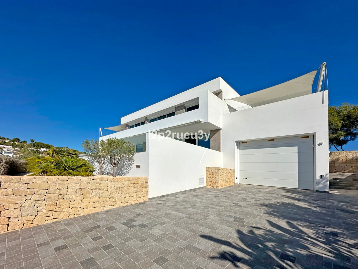 Discover this modern villa in the best location of Moraira -amp;nbsp; Benimeit with a stunning sea view.amp;nbsp;This property, built in 2021, is equipped with the latest technologies and high-quality finishes for maximum comfort.amp;amp;Upon entering, you are welcomed by an elegant entrance with built-in wardrobes and a living-dining room of approximately 80 m² with an open kitchen and central island. Next to the kitchen, there is a practical storage and pantry area.amp;amp;The large windows on the ground floor offer panoramic sea views and direct access to the pool, terrace, and outdoor shower.amp;amp;From the dining room, you access the covered outdoor kitchen and the outdoor dining area, which can be closed on the west side with glass curtains.amp;amp;On this floor, there is also a modern bathroom with a spacious walk-in shower.amp;amp;Upstairs, there are three bedrooms and an additional bathroom with both a shower and a bathtub, from which you can enjoy sea views even while showering or bathing.amp;amp;All rooms have access to the southwest-facing terrace, where you can relax under the installed sunshade and enjoy an expansive view of the sea and surrounding landscape. A second terrace of approximately 40 m² is located to the southeast.amp;amp;Additional features of the villa:amp;amp;Spacious garage (8m x 5m) with a clearance height of 3.10 m, ideal for motorhome owners.Underfloor heating with a heat pump, air conditioning (hot and cold), and 20 solar panels with a capacity of 13,856 KWH (EPC A).Pool with automatic cover and solar panels.Three-phase electricity available and a 6000-liter rainwater tank.All windows and terrace doors that can be opened are equipped with mosquito screens; all window surfaces have interior blinds, along with automatic shutters in the bedrooms.Four automatic awnings for additional shade on the pool terrace.Comprehensive alarm system for both interior and exterior.Garden with automatic irrigation.amp;amp;This villa is built with high-quality materials and offers everything discerning buyers are looking for: quality, tranquility, and spectacular views. Donapos;t miss this unique opportunity and schedule a visit today!~