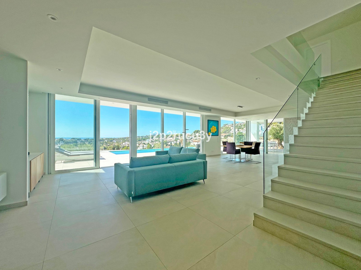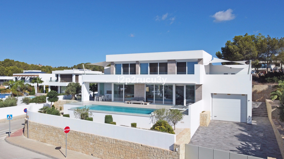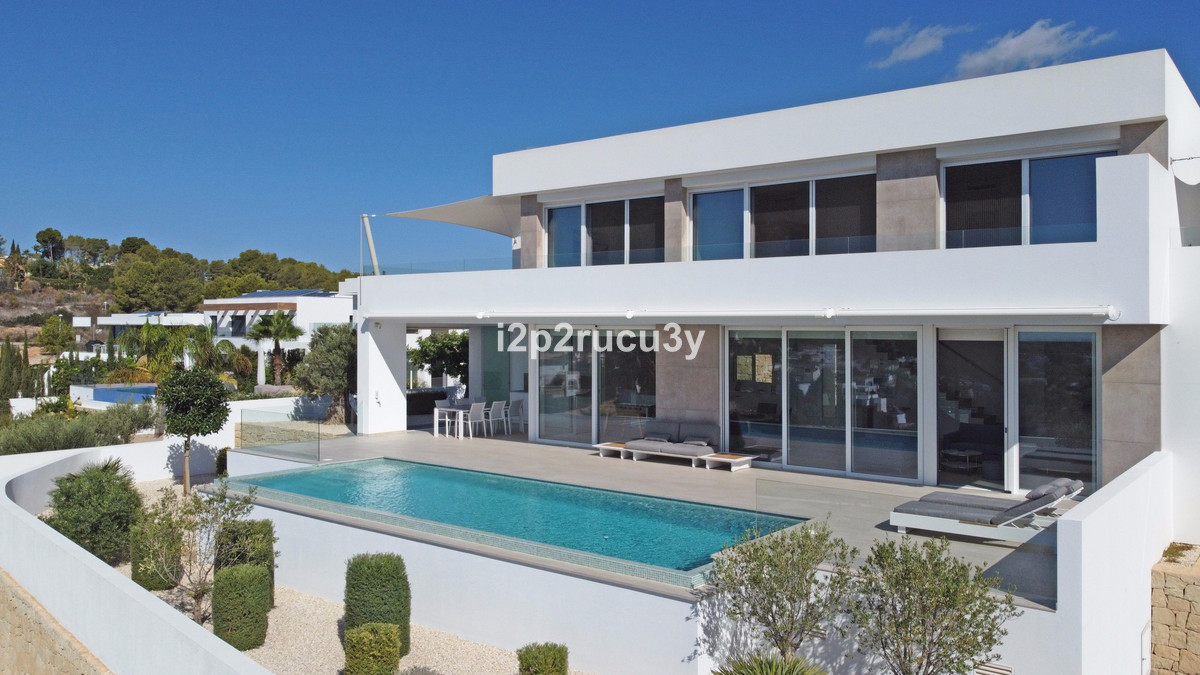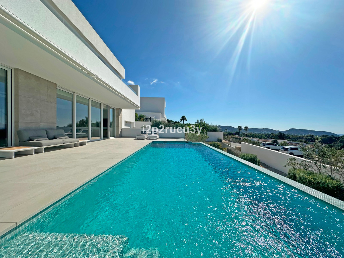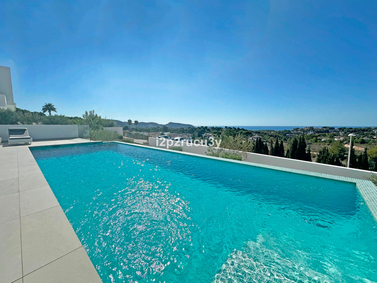 Discover this modern villa in the best location of Moraira -amp;nbsp; Benimeit with a stunning sea view.amp;nbsp;This property, built in 2021, is equipped with the latest technologies and high-quality finishes for maximum comfort.amp;amp;Upon entering, you are welcomed by an elegant entrance with built-in wardrobes and a living-dining room of approximately 80 m² with an open kitchen and central island. Next to the kitchen, there is a practical storage and pantry area.amp;amp;The large windows on the ground floor offer panoramic sea views and direct access to the pool, terrace, and outdoor shower.amp;amp;From the dining room, you access the covered outdoor kitchen and the outdoor dining area, which can be closed on the west side with glass curtains.amp;amp;On this floor, there is also a modern bathroom with a spacious walk-in shower.amp;amp;Upstairs, there are three bedrooms and an additional bathroom with both a shower and a bathtub, from which you can enjoy sea views even while showering or bathing.amp;amp;All rooms have access to the southwest-facing terrace, where you can relax under the installed sunshade and enjoy an expansive view of the sea and surrounding landscape. A second terrace of approximately 40 m² is located to the southeast.amp;amp;Additional features of the villa:amp;amp;Spacious garage (8m x 5m) with a clearance height of 3.10 m, ideal for motorhome owners.Underfloor heating with a heat pump, air conditioning (hot and cold), and 20 solar panels with a capacity of 13,856 KWH (EPC A).Pool with automatic cover and solar panels.Three-phase electricity available and a 6000-liter rainwater tank.All windows and terrace doors that can be opened are equipped with mosquito screens; all window surfaces have interior blinds, along with automatic shutters in the bedrooms.Four automatic awnings for additional shade on the pool terrace.Comprehensive alarm system for both interior and exterior.Garden with automatic irrigation.amp;amp;This villa is built with high-quality materials and offers everything discerning buyers are looking for: quality, tranquility, and spectacular views. Donapos;t miss this unique opportunity and schedule a visit today!~