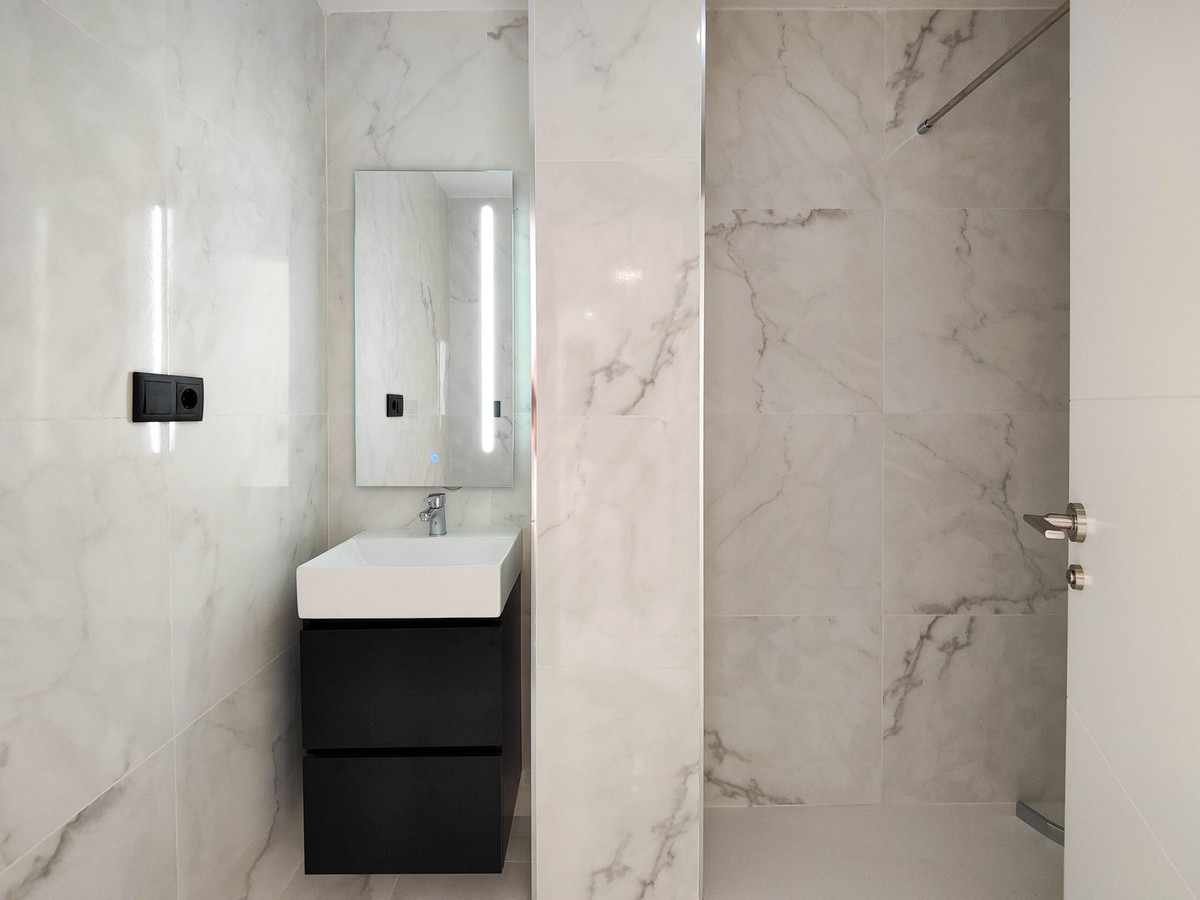 Beautiful completely renovated south facing apartment with views over the swimming pool for sale in Rocío del Mar ? Punta Prima ? Torrevieja. Located in a building with elevator, covered and fenced parking for residents and a huge communal swimming pool with lifeguard. Very well kept building.This wonderful apartment has been completely renovated, including electrical installation and plumbing, ready to move into.The apartment has 2 large bedrooms with fitted wardrobes and access to the terrace, 2 bathrooms (both with shower), a bright living / dining room with a beautiful brand new integrated kitchen.The bedrooms and the terrace enjoy an excellent SOUTH orientation, which gives them a lot of natural light. From the terrace we have unobstructed views over the communal pool, ideal for keeping an eye on the children.OPTIONAL closed garage in the underground garage available if required.Privileged location, a few steps from the bars, restaurants, supermarkets and the beaches of Punta Prima.Do not miss the opportunity to buy this beautiful completely renovated south facing apartment with the best orientation and on the best location in Punta Prima!~