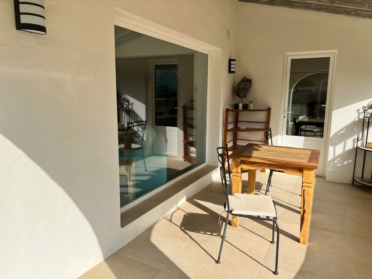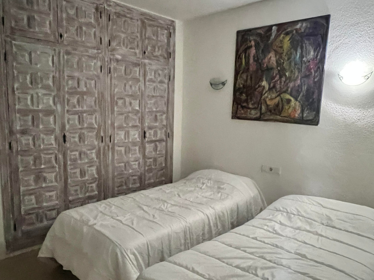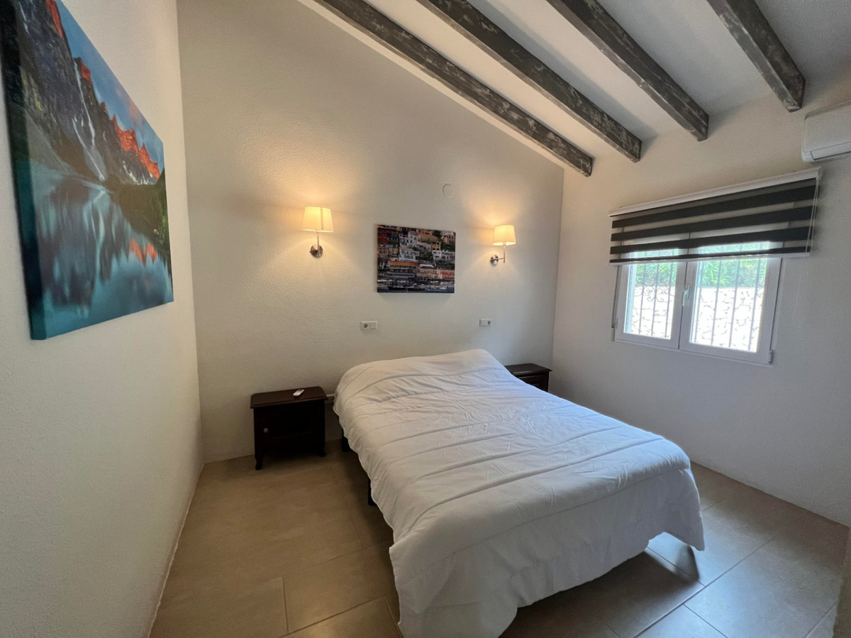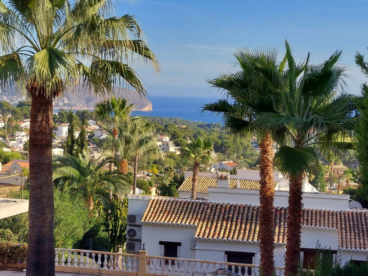 Villa with sea views in Moraira in the area Piar del Advocat for saleYou find this sea view villa for sale in Moraira within a short distance to the town, the beaches and the San Jaime Golf Course. Access is either via the electric gates or the pedestrian gate, both leading to the property. Accommodation is set on two levels. Upper level:A security door opens to the entrance hall where you also find the internal staircase, an inner hallway leads to the open plan lounge/dinig room and open plan fully equipped kitchen, all overlooking the mediterranean sea and bay. In addition on this level you find two double bedrooms and two family bathrooms. From the living area several doors lead out to the outdoors. Lower level:Downstairs you find another two double bedrooms, a family bathroom, the master bedroom with en-suite bathroom and access to the pool terrace as well as ample storage, boiler room and the garage. Outdoors:Outside you find a private 8 x 4m heated pool surrounded by spacious terraces, covered and uncovered, as well as BBQ area, in addition, you have beautifully landscaped gardens and parking facilities. Features:Central Heating, hot and cold air-conditioning throughout, double glazing, mosquito nets, security door, electric gates, pool and panoramic sea views.      ~