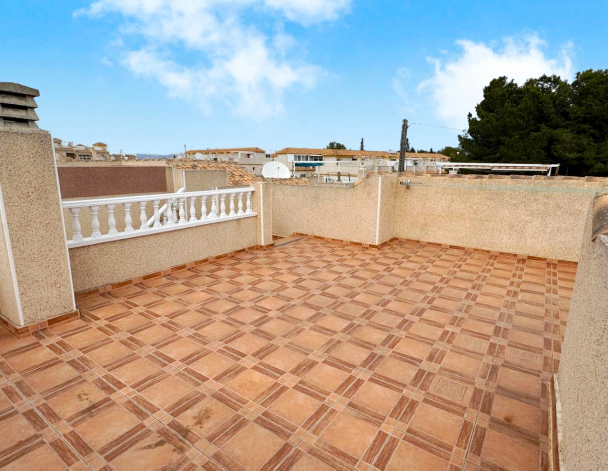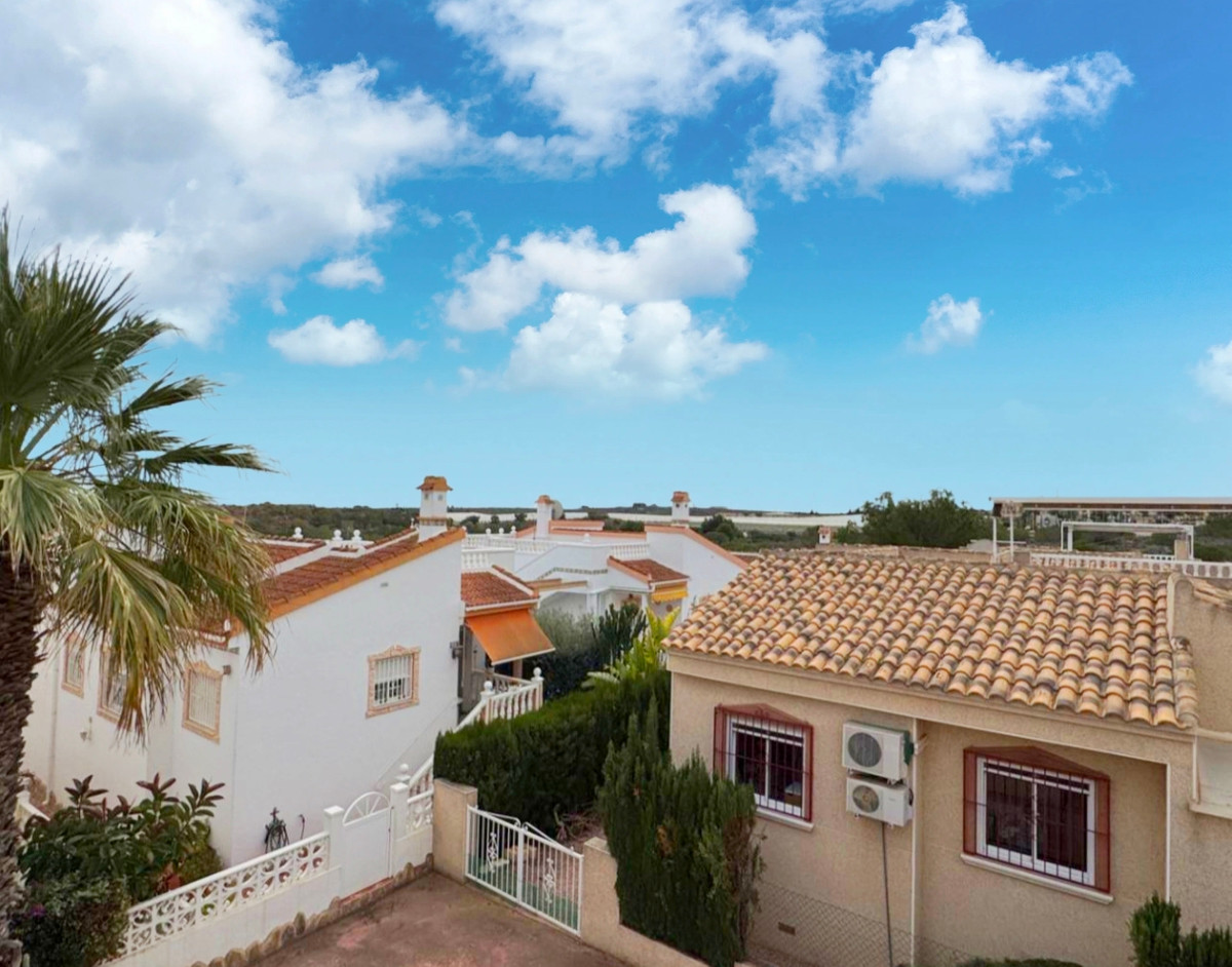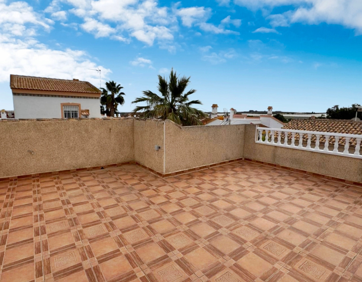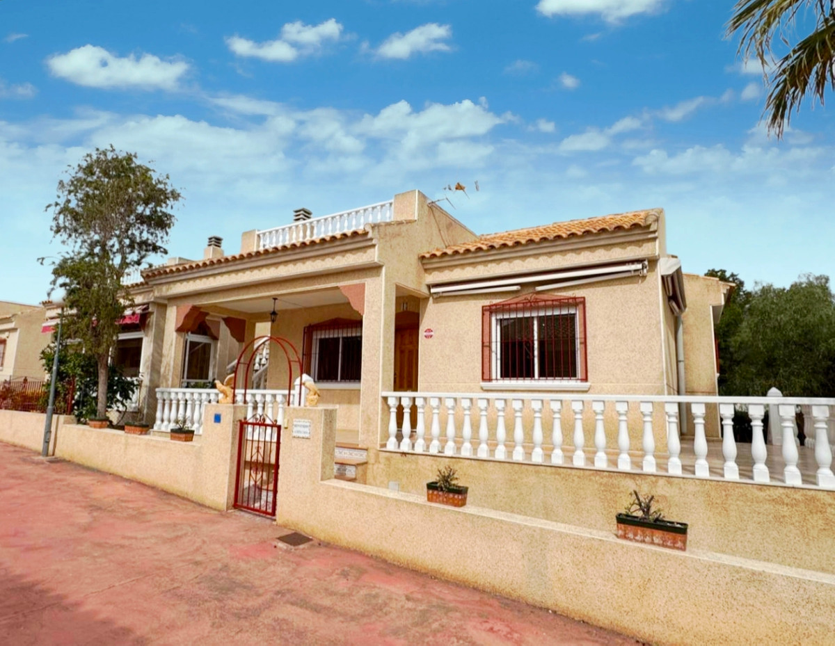 Located at the end of a cul de sac on the popular Montemar urbanisation in Algorfa is this three bedroom detached villa.At the front of the property is a large covered terrace with external stairs onto the roof solarium. This space has plenty of run to relax and entertain, and to take in the views. Internally you have a spacious living area to the front with fireplace in a corner. Separate kitchen off with utility area. There are two double bedrooms, both with fitted wardrobes along with a smaller bedroom, again with wardrobes. Finally a large family bathroom.Externally there are gardens all around the property along with access to an underbuild of approx 18 square metres, ideal for storage. The villa is part of a well-maintained community that offers a range of amenities, including a communal swimming pool and shared landscaped areas, perfect for leisure and socialising. This property is an excellent opportunity for those seeking a serene lifestyle in a welcoming neighbourhood.~