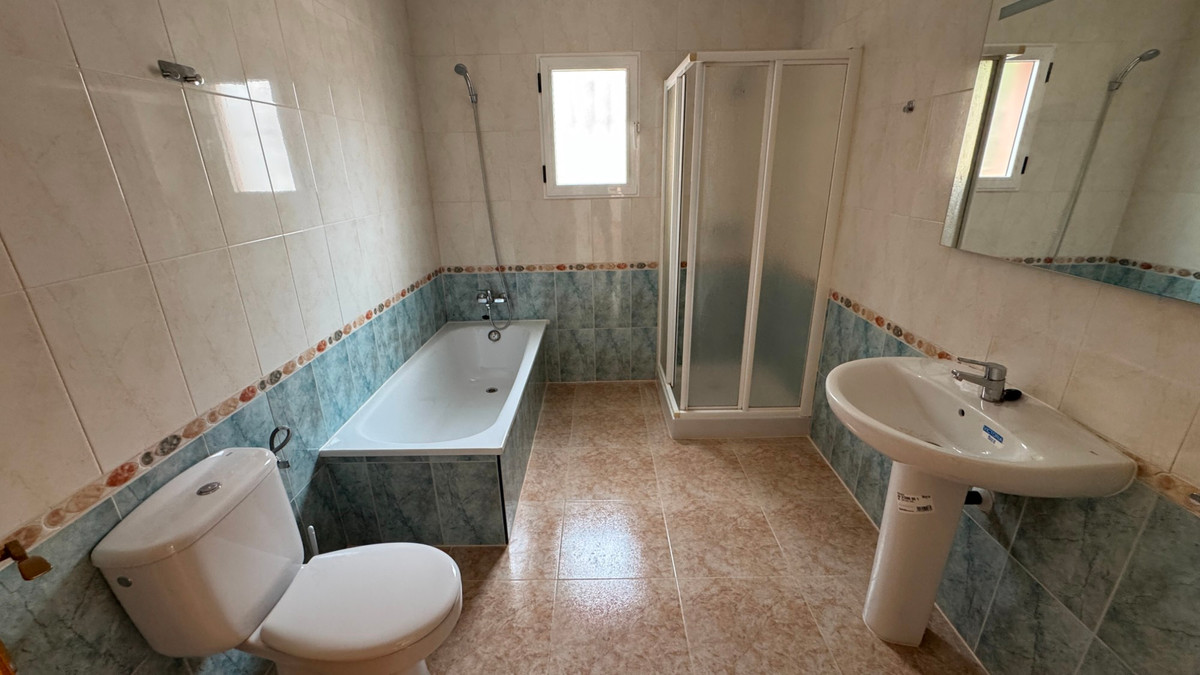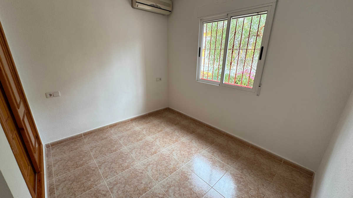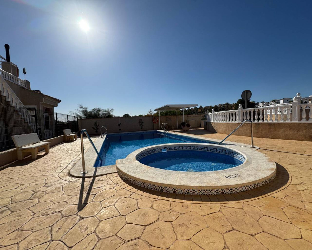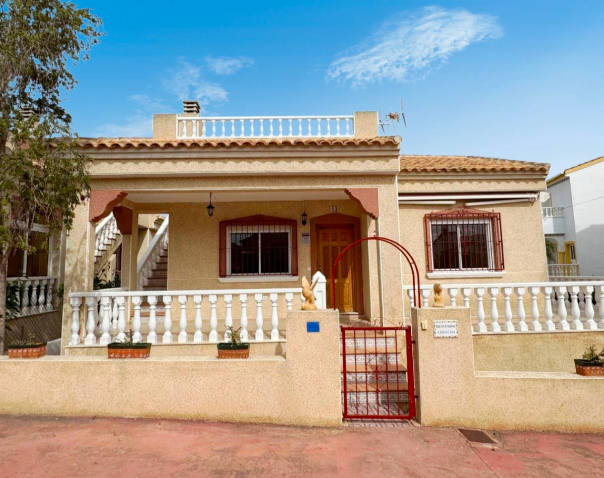 Located at the end of a cul de sac on the popular Montemar urbanisation in Algorfa is this three bedroom detached villa.At the front of the property is a large covered terrace with external stairs onto the roof solarium. This space has plenty of run to relax and entertain, and to take in the views. Internally you have a spacious living area to the front with fireplace in a corner. Separate kitchen off with utility area. There are two double bedrooms, both with fitted wardrobes along with a smaller bedroom, again with wardrobes. Finally a large family bathroom.Externally there are gardens all around the property along with access to an underbuild of approx 18 square metres, ideal for storage. The villa is part of a well-maintained community that offers a range of amenities, including a communal swimming pool and shared landscaped areas, perfect for leisure and socialising. This property is an excellent opportunity for those seeking a serene lifestyle in a welcoming neighbourhood.~